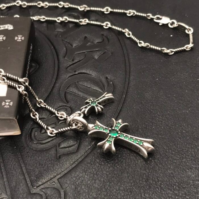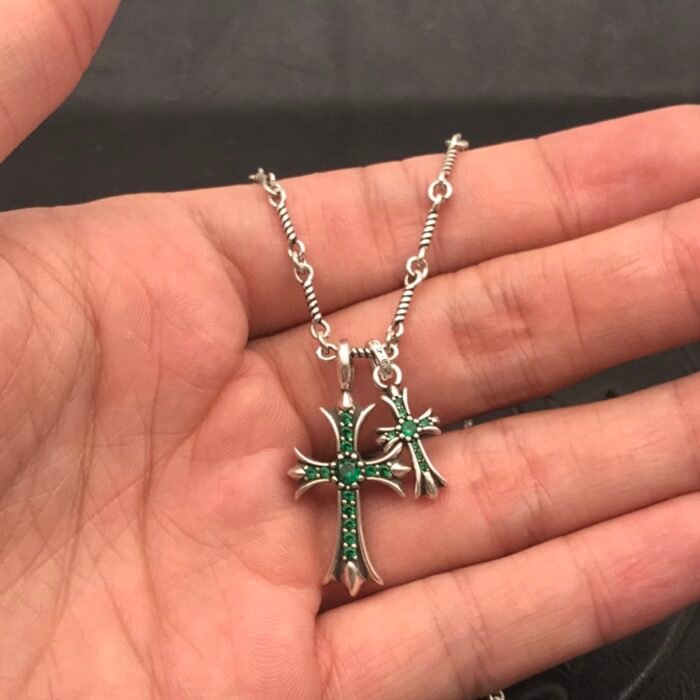 Home Chrome Hear* Necklace Green Diamond Distressed Double Cross Necklace(克家绿钻做旧款双十字架项链)