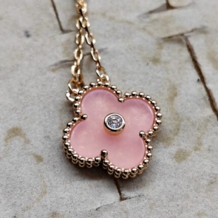 Rose quartz single motif necklace-with zircon(玫瑰石英间钻四叶草项链)
