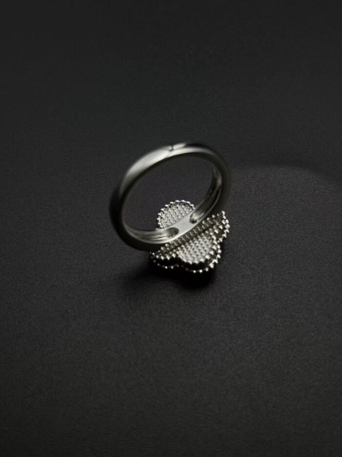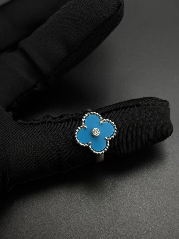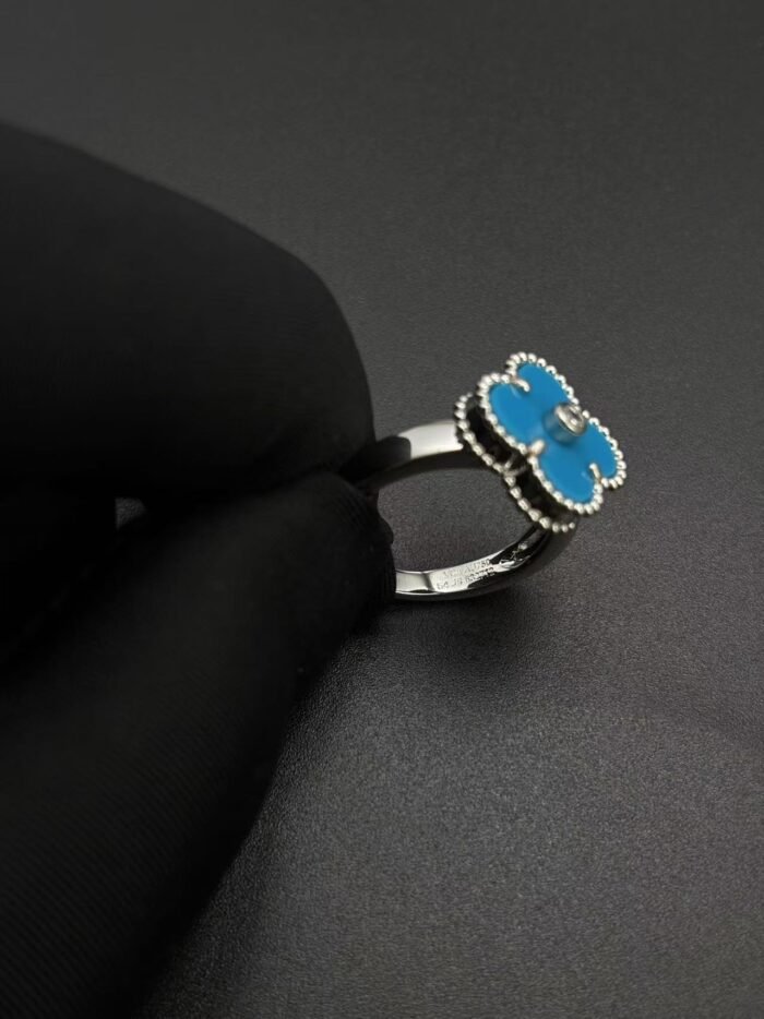 Home Van Cle* Ring Silver turquoise motifs ring with stone(银色绿松石带钻四叶草单花戒指)