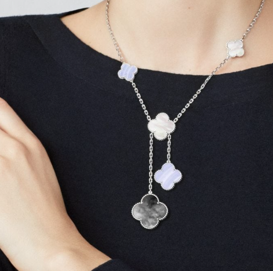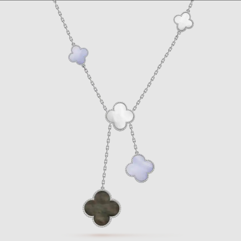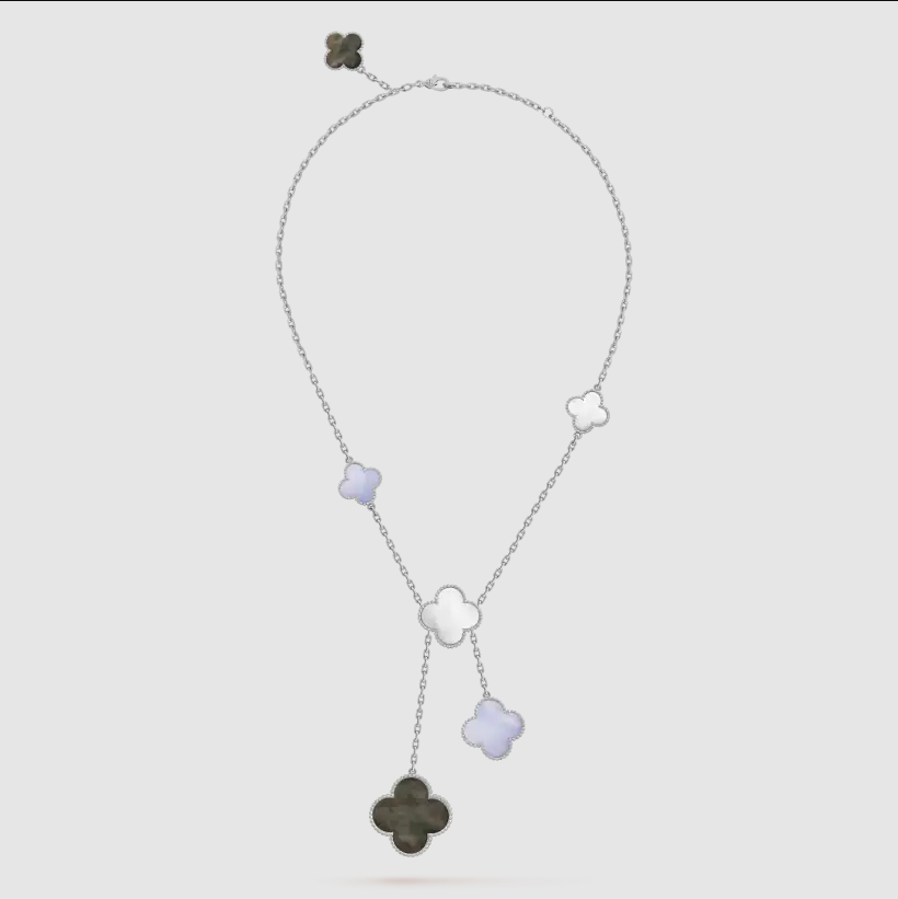 Home Van Cle* Necklace White gold chain miscellaneous stones irregular 6 motifs necklace-white pearl + gray earl + purple chalcedony(银色杂石不规则四叶草六花项链-白贝母+灰贝母+紫玉髓)