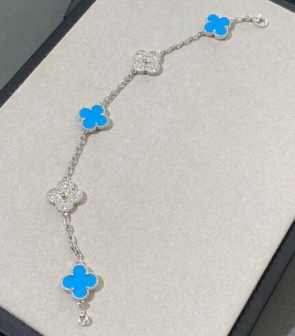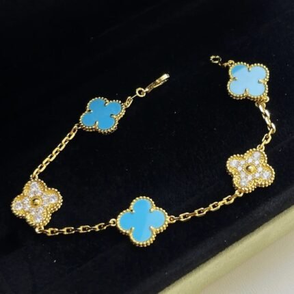 Turquoise 5 motifs bracelet- with zircon(绿松石间钻四叶草五花手链)